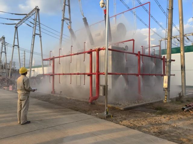变电运维人员在220千伏六助变验收主变水喷雾系统