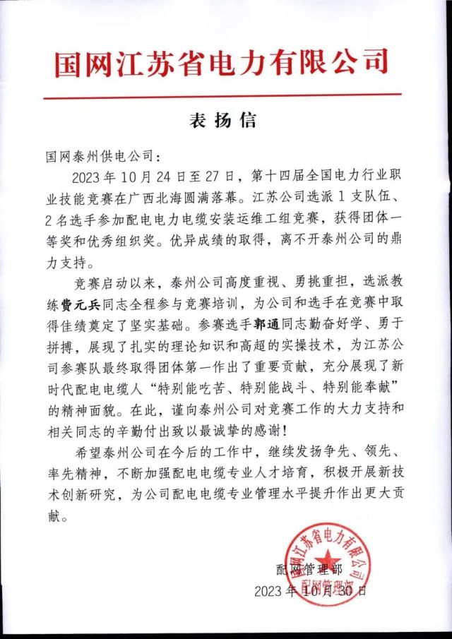 分公司选派经验丰富的教练费元兵和优秀选手郭通,助力省公司获得2023年全国行业职业技能竞赛——第十四届全国电力行业职业技能竞赛(电力电缆安装运维工)团体一等奖和优秀组织奖,获省公司感谢信。