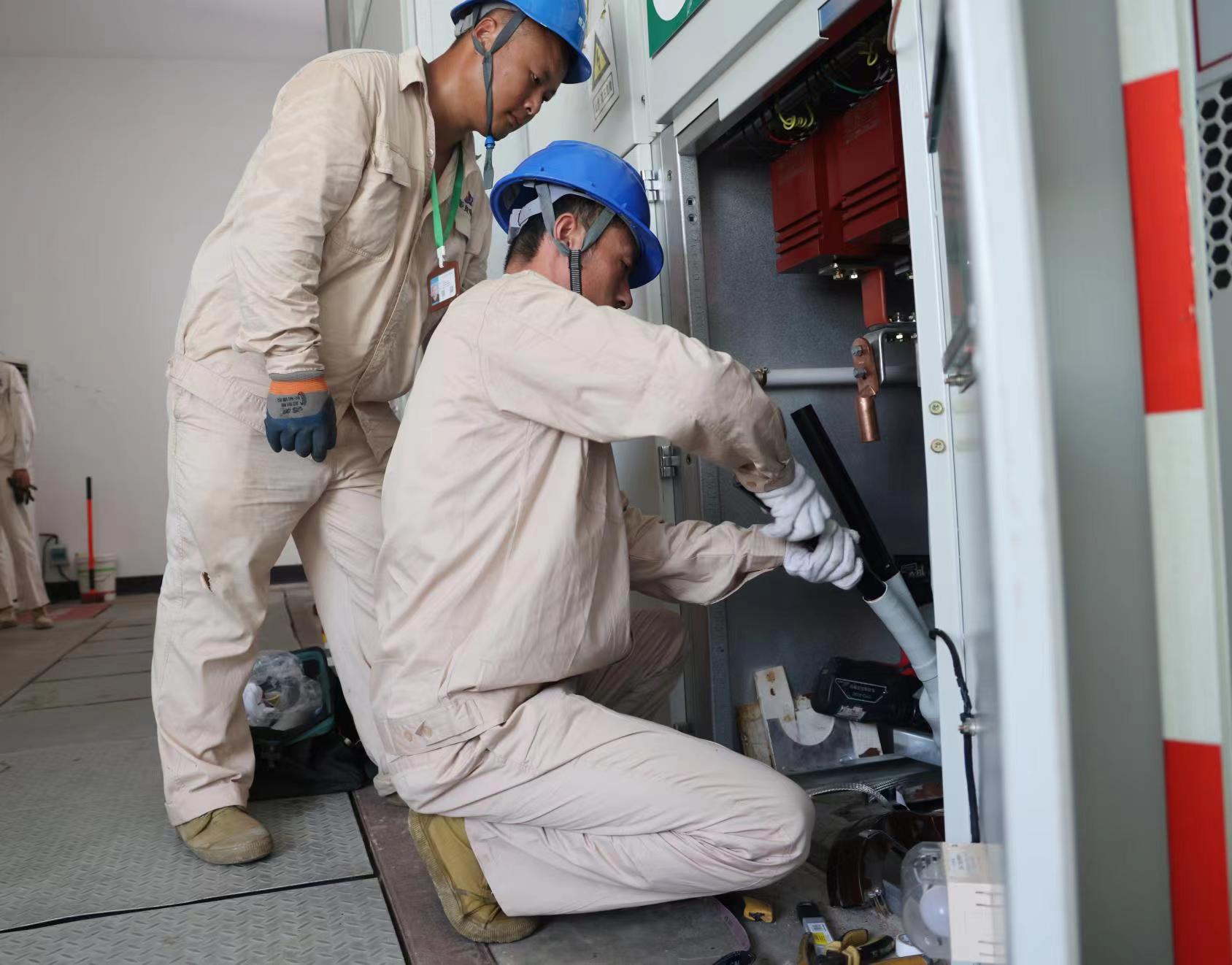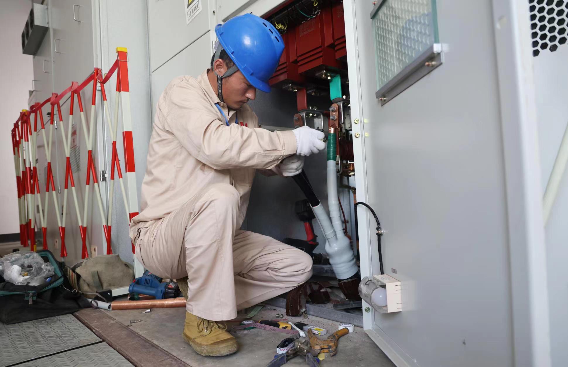 8月3日,国网连云港市赣榆区供电公司施工人员,在110千伏北郊变10千伏代岭127开关柜间隔柜后进行电缆头制作、搭头作业施工等,进一步提升电网运行能力,助力周边居民夏季用电可靠。