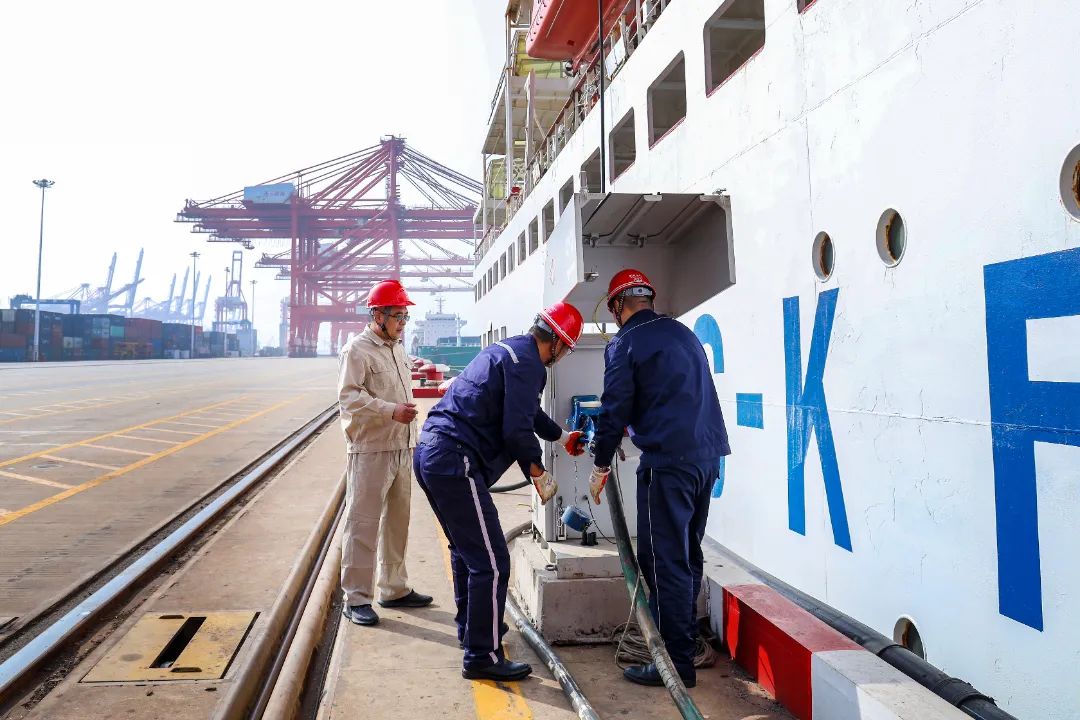 国网连云港供电公司工作人员为中韩航线“紫玉兰号”开展岸电接入服务。