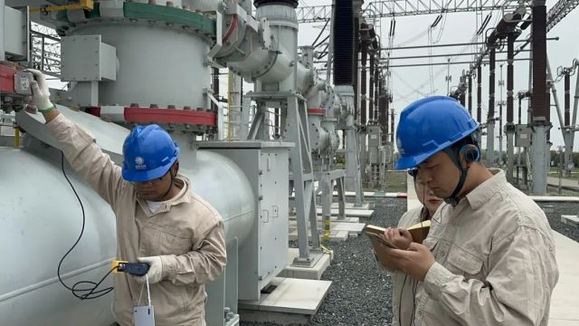 2月8日,公司在全省率先完成500千伏德国雷兹流变隐患治理销号,泰州地区最后一组雷兹流变更换后,500千伏变电运检中心检修人员正在对新换流变开展耐压测试。