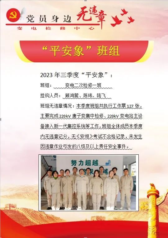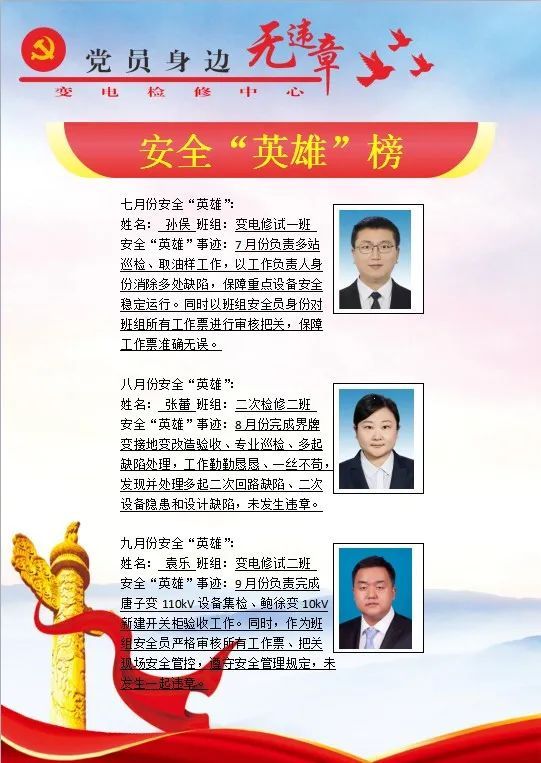 10月8日,变电检修中心对三季度安全“英雄”榜和“平安象”班组进行公示,三名无违章个人及一检修班组受到表彰。