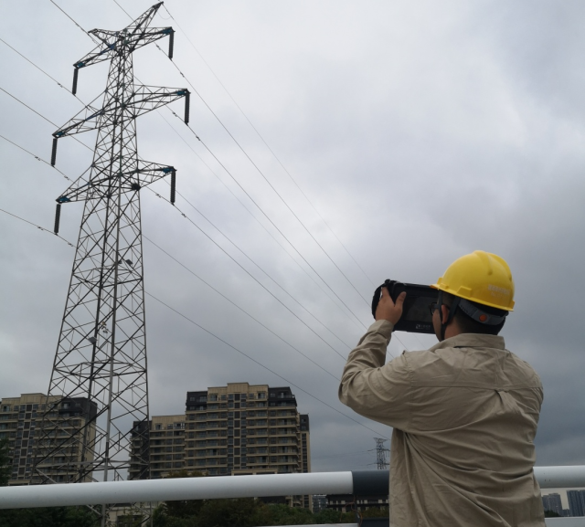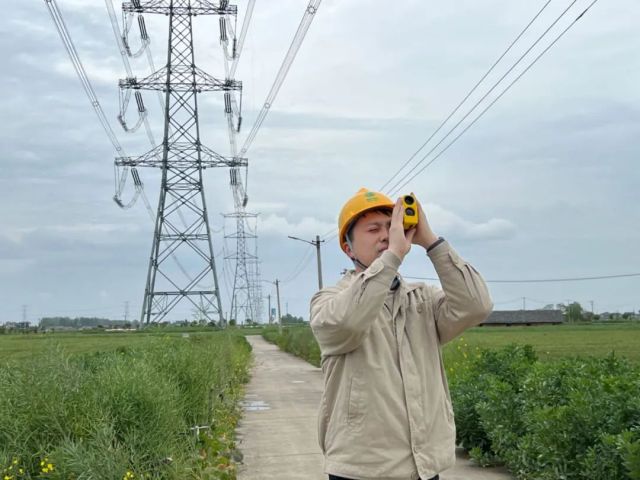 5月23日,输电运检中心对1000千伏盱泰线通道内隐患进行跟踪测量。