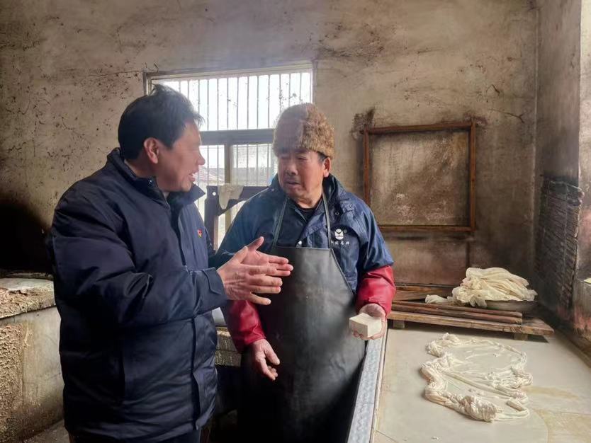 没过多停留,周维忠一行又赶往村里一户家庭豆腐坊。78岁的陈立珠和妻子做豆腐已有43个年头,每年春节前都是最忙的时候。夫妻俩年事已高,平时对用电安全不是很上心,周维忠放心不下,特意赶去帮助检查用电线路和设备,宣传安全用电知识。“老陈,这几天豆腐卖得怎么样?”“书记好!这几天生意太好了,每天能卖掉400多块,用掉黄豆60多斤!”“忙点好,但起早贪黑很辛苦,要多注意身体。春节期间用电有啥事,随时给我打电话。”周维忠和陈立珠热络地聊着天,看到土灶里柴火快烧完,立马抓了把干草放进去,原本将熄的火星又燃起了明亮的火花。